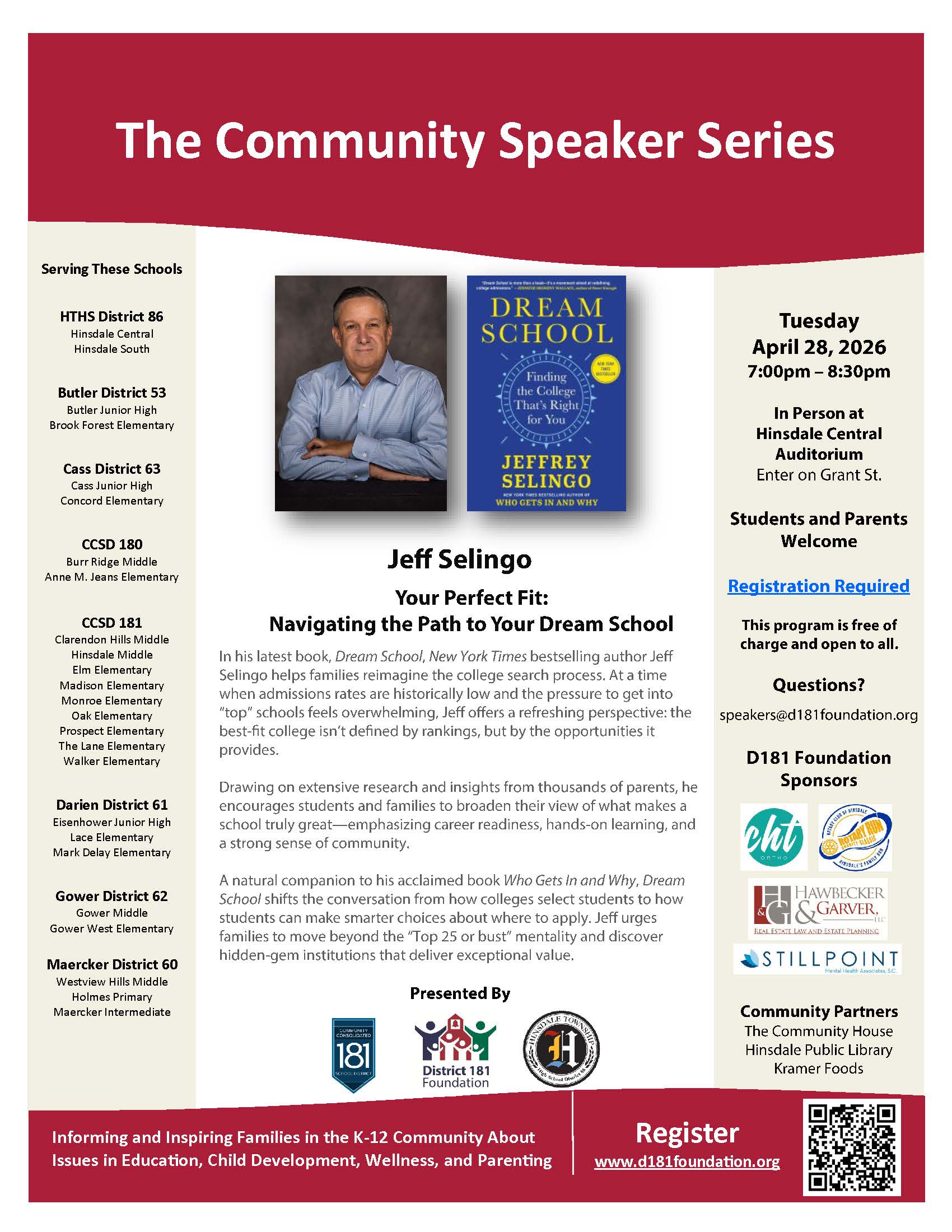 Jeffrey Selingo Tuesday, April 28, 2026 7-8:30 p.m. In-person at Hinsdale Central Auditorium This program is for students and parents