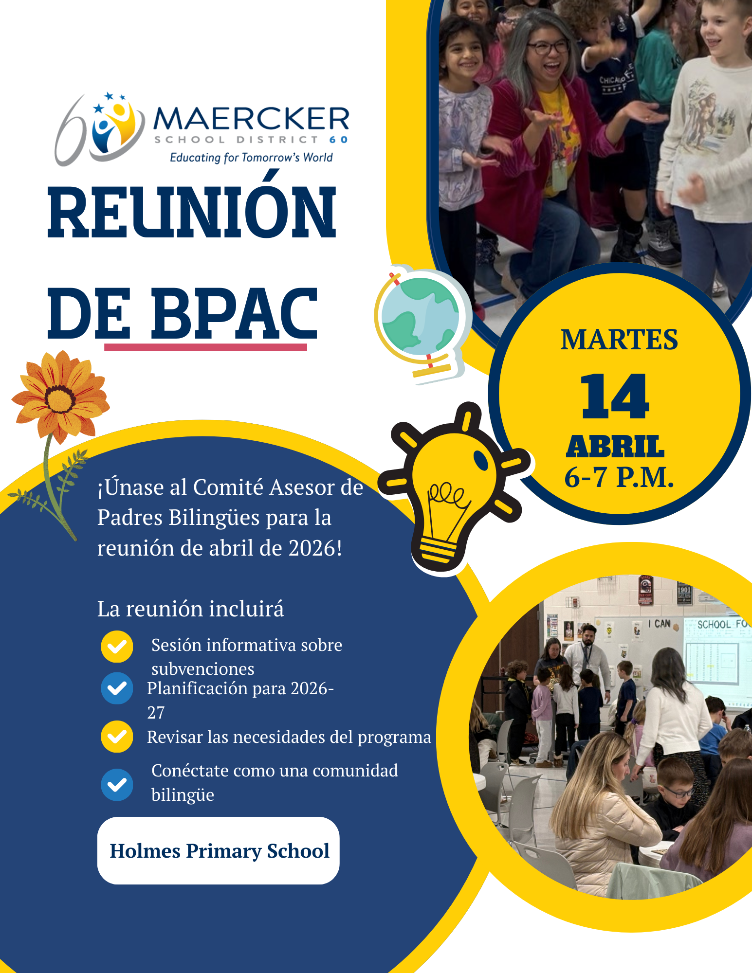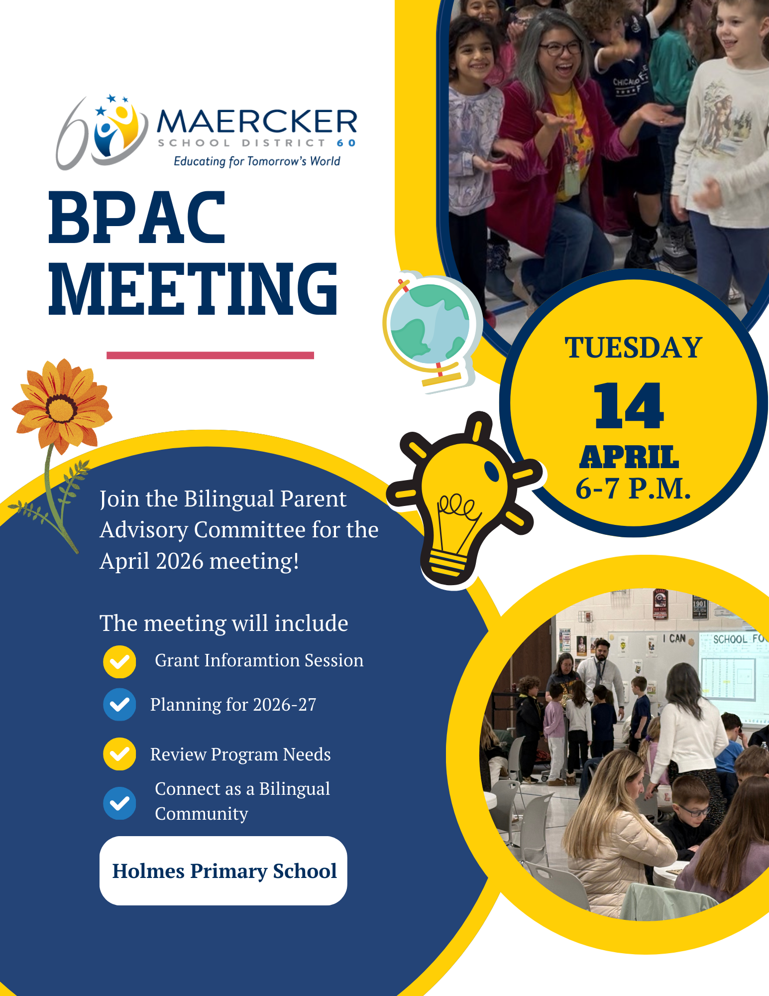 You are invited to the last BPAC meeting of the 2025-26 school year coming up on Tuesday, April 14. We will talk about grants, planning for next year, and creating strong connections between families! Event: BPAC Grant Information Session Date: Tuesday, April 14, 2026 Purpose: Grant Information Session and planning for the 2026–2027 school year Location: Holmes School