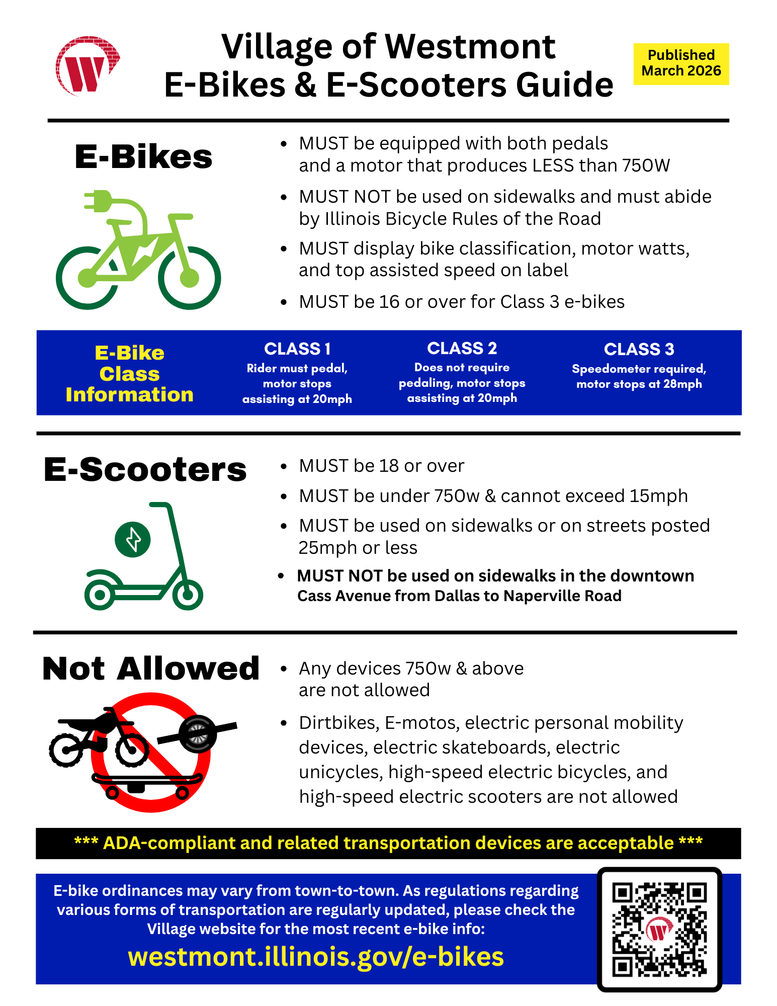 “In recent years, the popularity of these motorized vehicles has skyrocketed,” said Westmont Police Deputy Chief Steve Thompson. “This new ordinance will help define the local do’s and don’ts regarding e-bikes and scooters. Our primary objective is to make sure everyone is safe. The information for this program will be helpful for both kids and parents as well as all e-bike owners. Space is limited, so we ask everyone to RSVP online.”