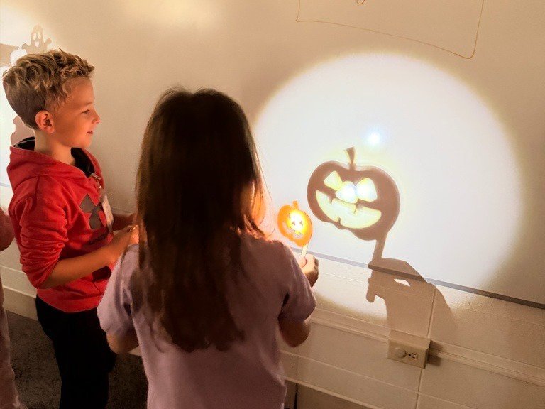 First graders at Holmes have been experimenting with light this fall. They’ve learned all about how light helps us to see and that opaque objects make shadows. |